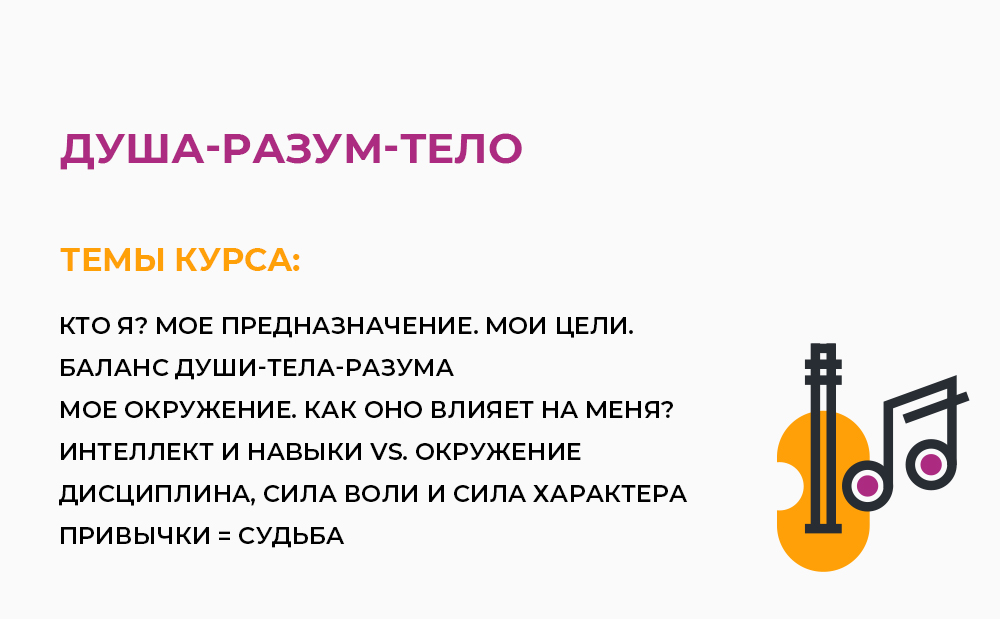 Это основной курс Atlas School цель которого – привести подростка к осознанному и сбалансированному саморазвитию. Для того чтобы прийти к разговорам о профессии, о деньгах, о карьере – прежде всего надо начинать со стержня, фундамента личности, с ценностей – души, тела и разума.