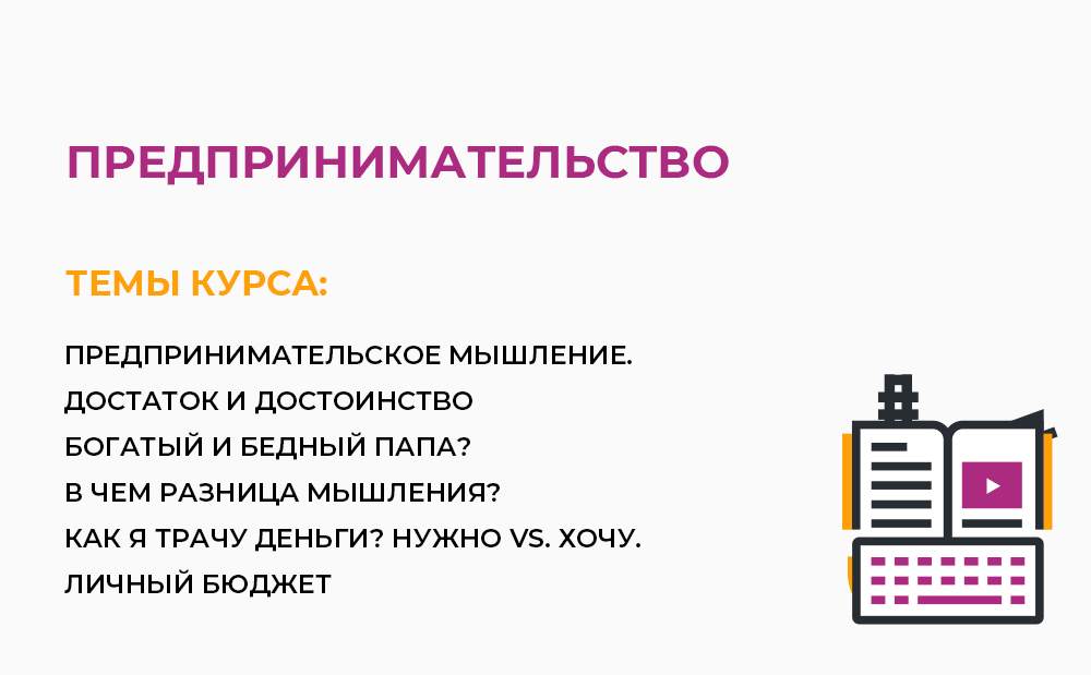 Этот курс помогает раскрыть дух предпринимательства в ребятах и осознать стоимость денег и времени, собственного труда и усилий, а также научит независимому мышлению и созданию своих проектов. От Потребительства к Созидательству. От Исполнительства к Проактивности и Творчеству.